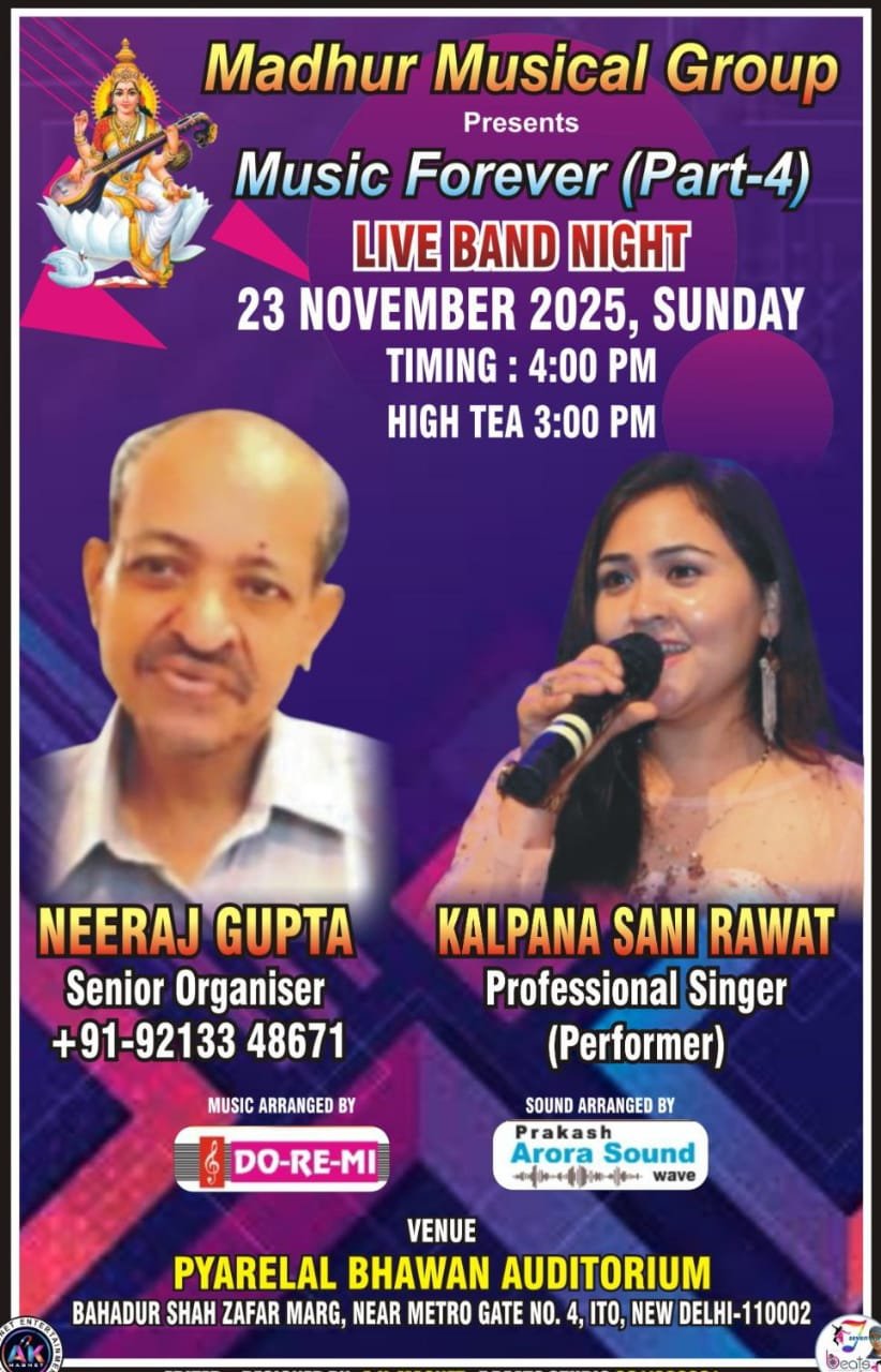 अब इसके अगले चौथे पार्ट “म्यूजिक फॉरएवर पार्ट-4” का आयोजन 23 नवंबर रविवार 2025 को प्यारे लाल भवन ओडिटोरिम आईटीओ में धूमधाम से होने जा रहा है। जिसमे हर बार की तरह दिल्ली- एनसीआर, बॉलीवुड और देश के अन्य शहरो से आए अनेक सुरीले गायक-गायिकाये हिस्सा लेंगे और लाइव सिंगिंग करेंगे।