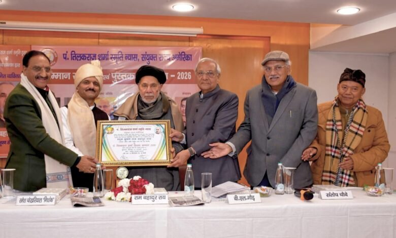 साहित्य अकादेमी के सभागार में पं. तिलकराज शर्मा स्मृति न्यास, संयुक्त राज्य अमेरिका के तत्वावधान में “सम्मान समारोह एवं पुस्तक लोकार्पण -2026” का भव्य आयोजन